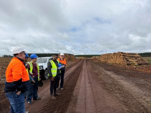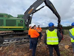 Key topics included land preparation and post-harvest log staging to ensure stable supply; exposure to heavy machinery used in harvesting and forest management; factory operations; and technical discussions on log grading, forest fire protection, mill runs, and adhesive requirements for CLT production.