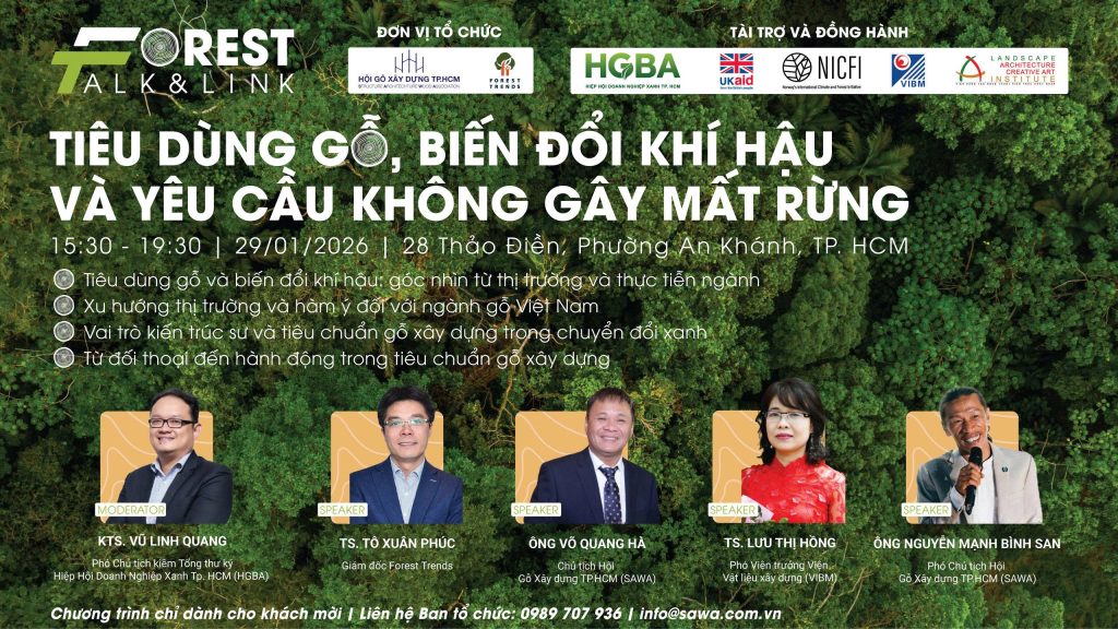 FOREST TALK & LINK là chương trình do Hội Gỗ Xây Dựng TP. Hồ Chí Minh (SAWA) và Forest Trends phối hợp tổ chức, diễn ra vào chiều ngày 29/01/2025 tại 28 Thảo Điền, TP. Hồ Chí Minh. Chương trình có sự tài trợ và đồng hành của Hiệp hội Doanh nghiệp Xanh TP. Hồ Chí Minh (HGBA), UK aid, Norway’s International Climate and Forest Initiative (NICFI), Viện Vật liệu Xây dựng (VIBM) và Viện Sáng tạo Nghệ thuật Kiến trúc Cảnh quan (LAA.I).