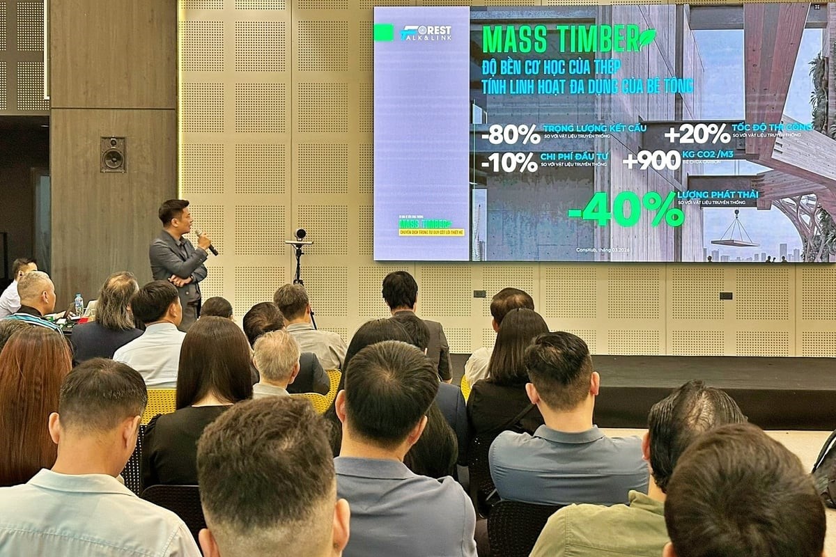 Gỗ kỹ thuật, đặc biệt là mass timber, được xem là một trong những hướng tiếp cận mới. Theo ông Quang, vật liệu này giúp giảm khoảng 40% lượng phát thải so với vật liệu truyền thống, đồng thời đóng vai trò như “bể chứa carbon” với khả năng lưu trữ hơn 900 kg CO2/m3 gỗ.